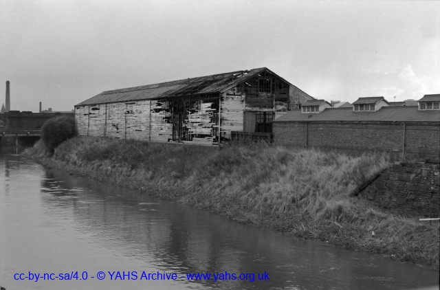 Timber structure with remains of cranes. Was sited on the south bank of the River Aire not far from the magnificent Leeds & Thirsk Railway company's roundhouse. North-eastern part of the G.N.R (later L.N.E.R) goods yard.